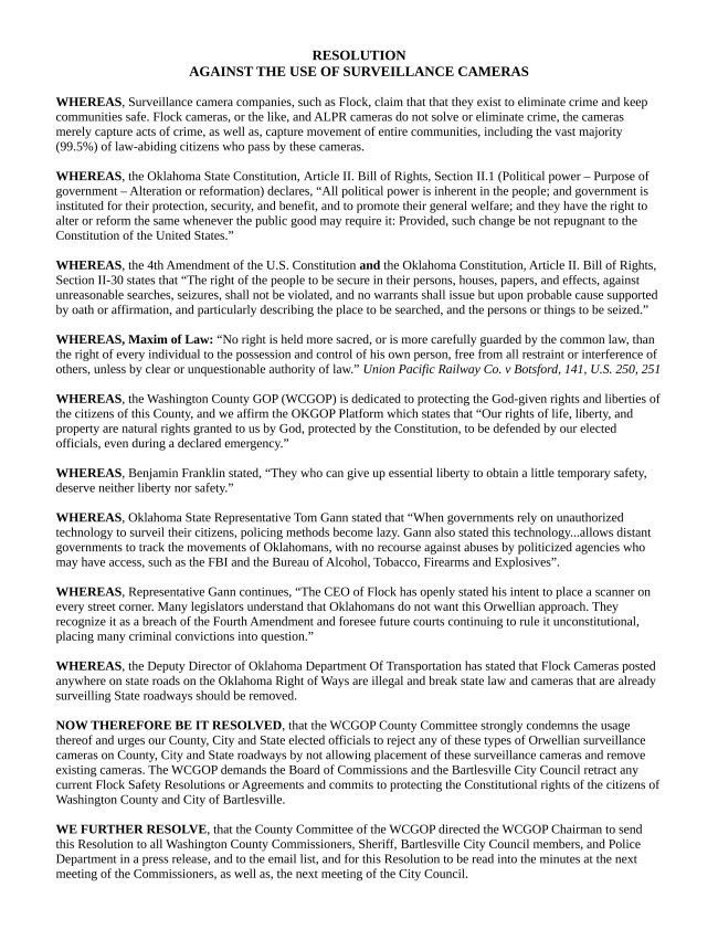 The Resolution strongly condemned the usage of these cameras and “urges our County, City and State elected officials to reject any of these types of Orwellian surveillance cameras on County, City and State roadways by not allowing placement of these surveillance cameras and remove existing cameras” as well as demanding that the Washington County Commissioners and Bartlesville City Council Members retract any current agreements with Flock.